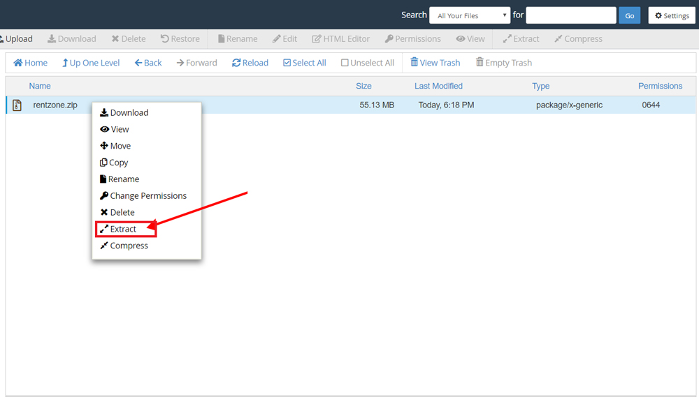 Migrate folders and files from zip file(rentzone.zip) with Cpanel.