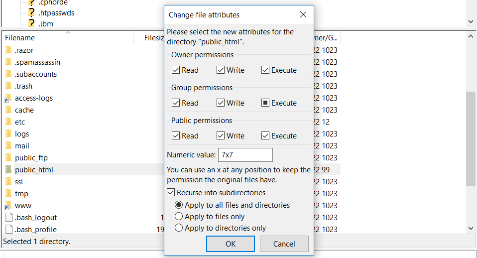 The folder "public_html" and it's subfolders must have write permissions, so just give the folder write permissions (777).